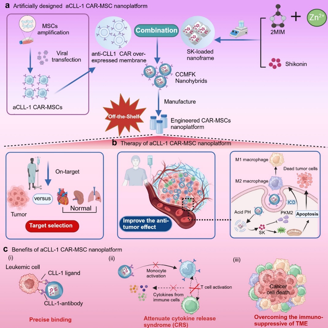 研究團隊以C型凝集素樣分子-1(CLL-1)作為研究靶點——該標誌物特異表達於AML細胞及白血病幹細胞表面,而在正常免疫細胞中幾乎不表達,具有很好的靶向性和治療安全性。研究人員進一步利用金屬有機框架ZIF-8結合天然抗癌化合物紫草素(Shikonin, SK),並用工程化的aCLL-1 CAR-MSC進行修飾,構建出具有「雙重靶向」能力的仿生治療體系。